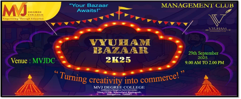 Vyuham Bazaar is a student-driven market fair organized by the Vyuham Management Club of MVJ Degree College. The event serves as a dynamic platform for students to exhibit their entrepreneurial spirit, creativity, and management skills. It brings together a variety of student-managed stalls offering products ranging from handmade crafts and fashion accessories to food and […]