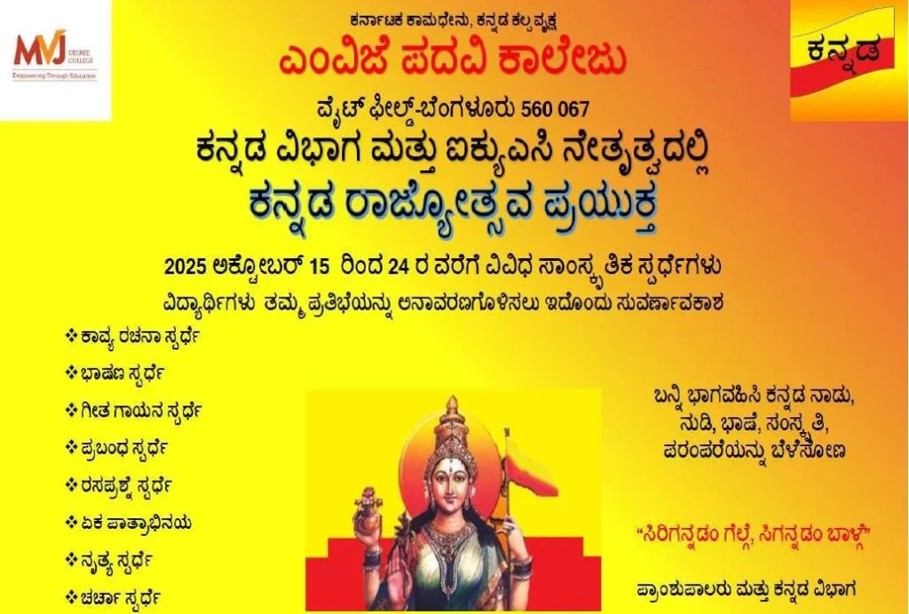 The Kannada Rajyotsava Celebrations 2025 at MVJ Degree College, Bengaluru, were organized by the Department of Kannada from 15th October to 24th October 2025 with the objective of promoting the richness of the Kannada language, literature, and culture. The event served as a tribute to the formation of the state of Karnataka and provided a […]